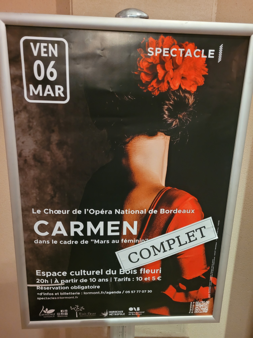 Vendredi 6 mars, à l’Espace culturel du Bois Fleuri : CARMEN. Depuis longtemps, c’était complet. Solistes et chœurs de l’Opéra National de Bordeaux donnaient l’opéra le plus célèbre du répertoire, rejoints sur la scène par l’ensemble vocal de l’école de musique et de danse de Lormont. Deux séances le même jour pour les habitants de la ville, 14h pour les enfants et 20h. Une convention passée entre l’équipe culturelle de la ville et l’Opéra National de Bordeaux, 18 mois de préparation.