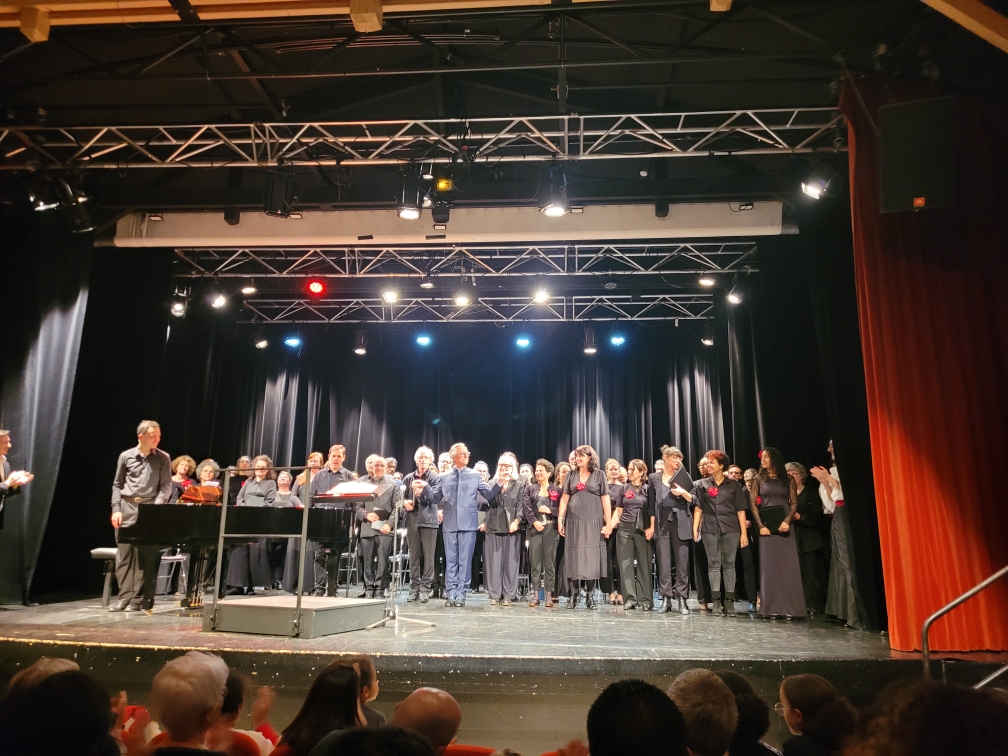 Au pupitre, le maestro Salvatore Caputo chef des chœurs, tout heureux de cette collaboration entre professionnels et amateurs, et agréablement complice avec le public. Les grands moments de l’opéra ont été chantés, avec l’accompagnement brillant du pianiste de l’école de musique Stéphane Trébuchet, à lui seul tout l’orchestre. Non moins formidable Loïc Richard, le récitant, qui faisait le lien entre les différents passages phares de l’opéra, dans un langage d’aujourd’hui, truculent. Il était chargé aussi de pointer l’actualité cruelle de la situation représentée, puisqu’elle n’est ni plus ni moins, après une montée dramatique, qu’un féminicide qui se déroule sous nos yeux. Face à l’amour possessif et menaçant de Don José, Carmen est une femme qui ne cède pas sur sa liberté et elle le paie de sa vie. Salvatore Caputo a conclu la représentation en rappelant combien pour faire ressentir le tragique de ces situations insupportables, la musique, par l’émotion qu’elle suscite, vaut bien tous les discours. Une émotion certaine pour les enfants aussi dans l’après-midi raconte-t-il. Pour les rassurer, il a fallu faire se relever très vite les comédiens effondrés. « C’était une fiction, ouf ! », mais pour eux aussi, une leçon de vie.